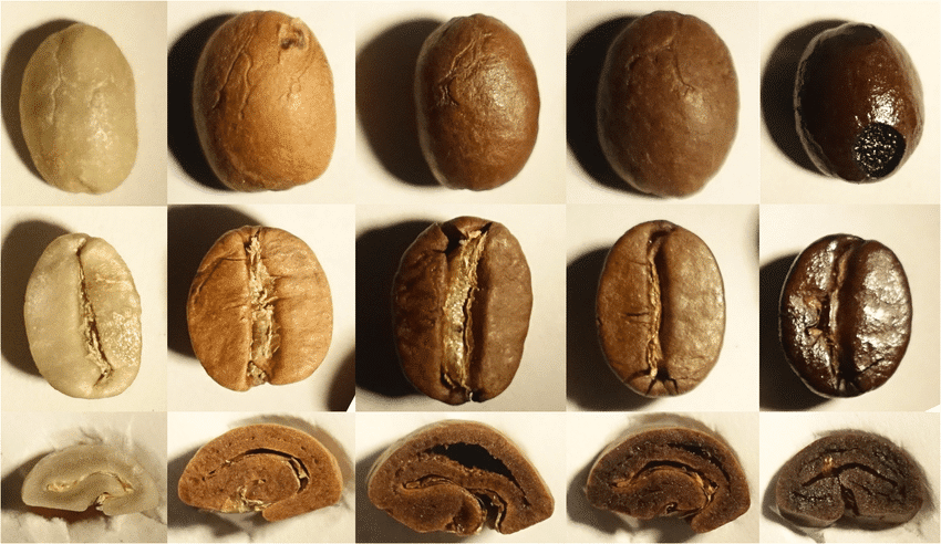 Café à différents stades de torréfaction, de gauche à droite : non torréfié, début du premier crack, fin du premier crack, début du second crack, fin du second crack. Une cavité est visible dans la section transversale après le premier crack, et après le second crack, le grain apparaît huileux et a parfois des parties fendues sur les côtés. ttps://www.researchgate.net/figure/Coffee-at-different-stages-of-roasting-from-left-to-right-unroasted-start-of-first_fig1_337090295 [accessed 23 Feb, 2023]